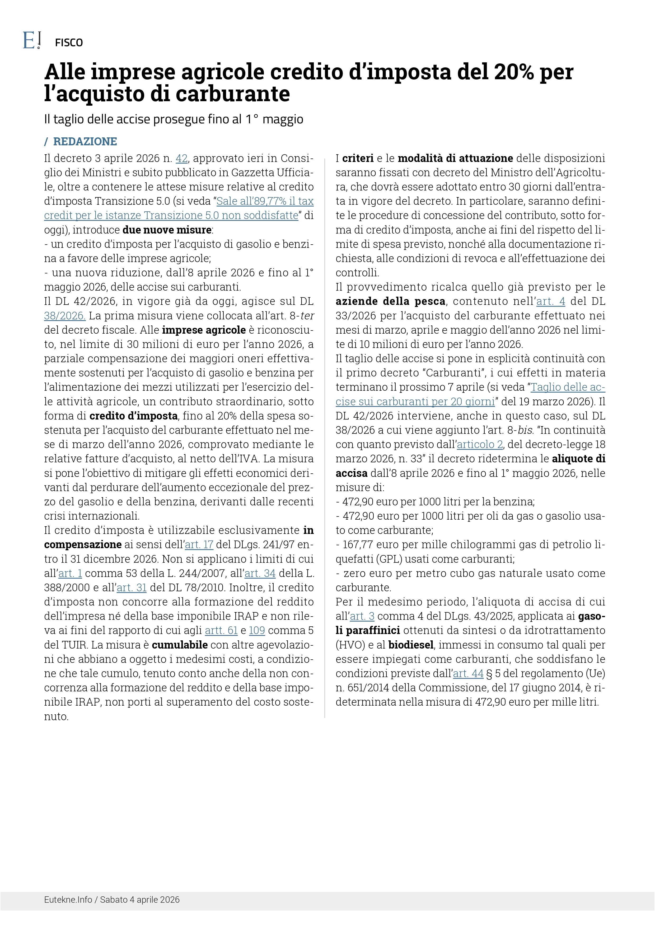 Alle imprese agricole, credito d'imposta del 20% sugli acquisti di carburante